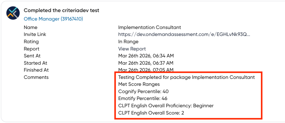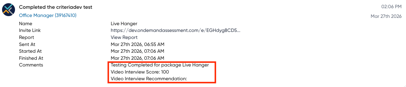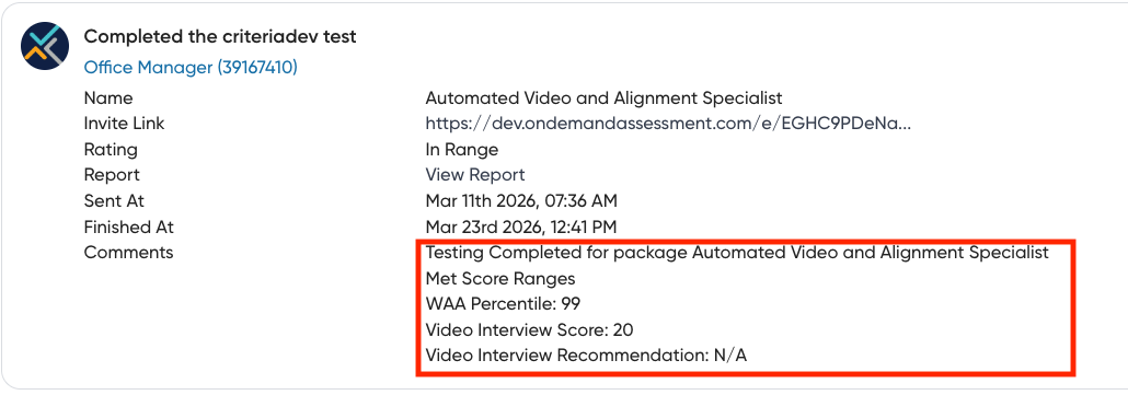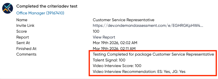 The Comments section will contain detailed specifics about the assessment, such as scores for each test within the assessment package, the candidate's Talent Signal, and any video interview recommendations if applicable.